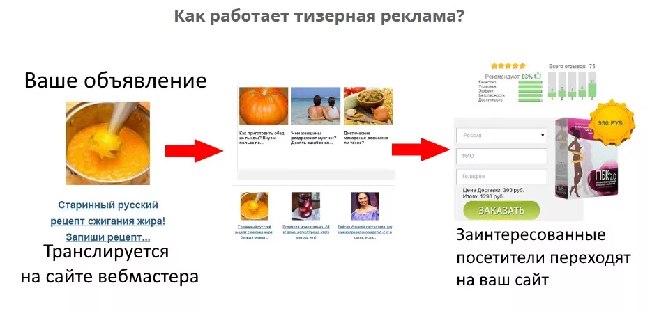 Тизерная реклама, которая размещается в интернете, работает по следующему принципу.