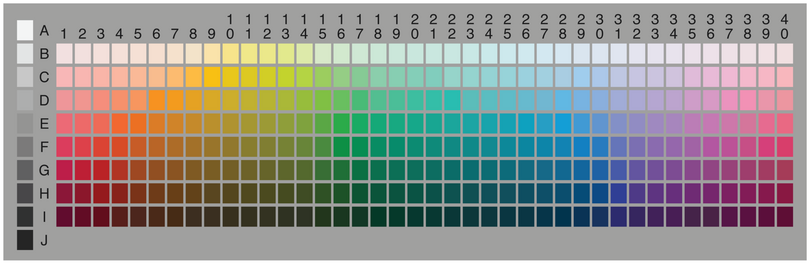 Основная цветовая палитра состоит из 12 цветов, которые могут быть объединены различными способами для создания разнообразных эффектов. Цвета могут дополнять друг друга, а также создавать хаос. Цвета делятся на категории теплых и прохладных. Теплые цвета, яркие и энергичные, припадают на колесе от красного до синего и до зеленого. Холодные цвета, которые варьируются от красного до оранжевого и желто-зеленого, считаются успокаивающими. Белый, черный и серый, являются нейтральными и берут на себя свойства окружающих цветов.