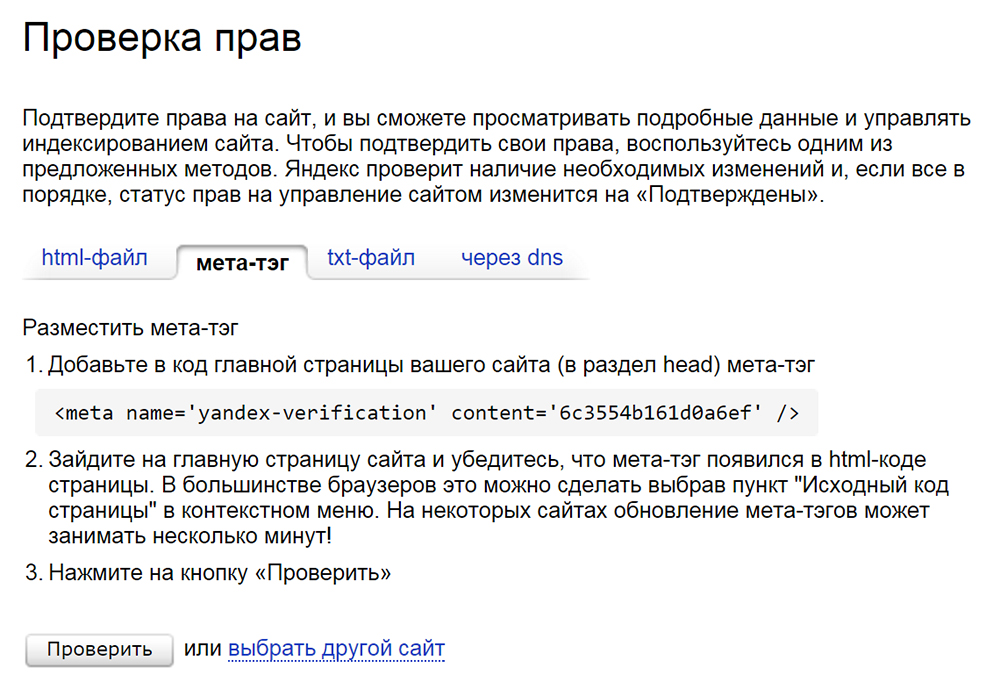 Информация, которая предоставляется на сервисе, является конфиденциальной и предназначена для владельцев сайтов или иных уполномоченных лиц, поэтому для управления сайтом в Вебмастере требуется подтверждение.