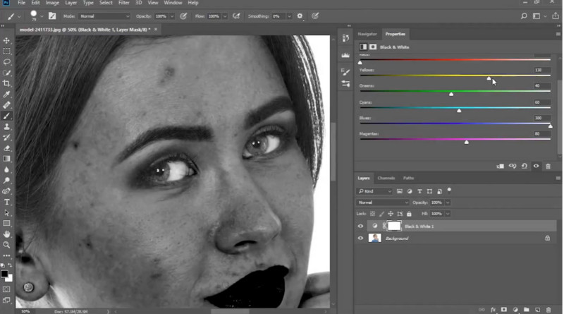 Передвиньте ползунок средних тонов влево. Инвертируйте маску слоя (комбинация клавиш Ctrl+I) и прорисуйте белки глаз небольшой белой кистью с жесткими краями.