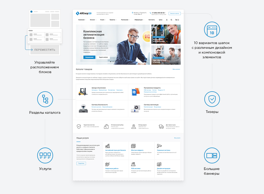 Объемный сайт, совмещающий в себе сразу несколько ключевых задач — представить компанию в Интернете и продавать товар либо генерировать из посетителя потенциального клиента. На таких сайтах размещается подробная информация о товарах или услугах, а также функции для связи с менеджерами компании. Такой тип корпоративных сайтов подходит компаниям, которые не имеют возможности выставлять актуальные цены к товарам. Причиной тому могут стать особенности бизнеса. Например, товар закупается в валюте и невозможно установить цену из-за постоянных скачков курса; товар/услуга продается на специальных условиях; продукция эксклюзивна или продается под индивидуальный заказ по параметрам клиента.