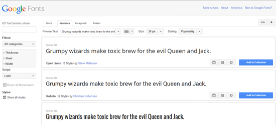 Наконец, впечатляет большой выбор шрифтов, предлагаемых Google Fonts.