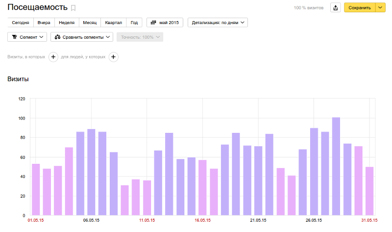 Важный момент: абсолютные цифры по посещаемости малополезны. Лучше отслеживать показатели в динамике, изучать, как меняется трафик с течением времени.