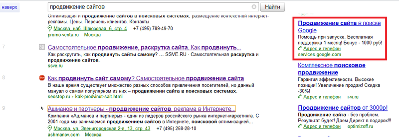 На странице результатов поиска вы встретите объявления различных компаний, ключевые слова которых соответствуют ключевым словам в вашем поиске.