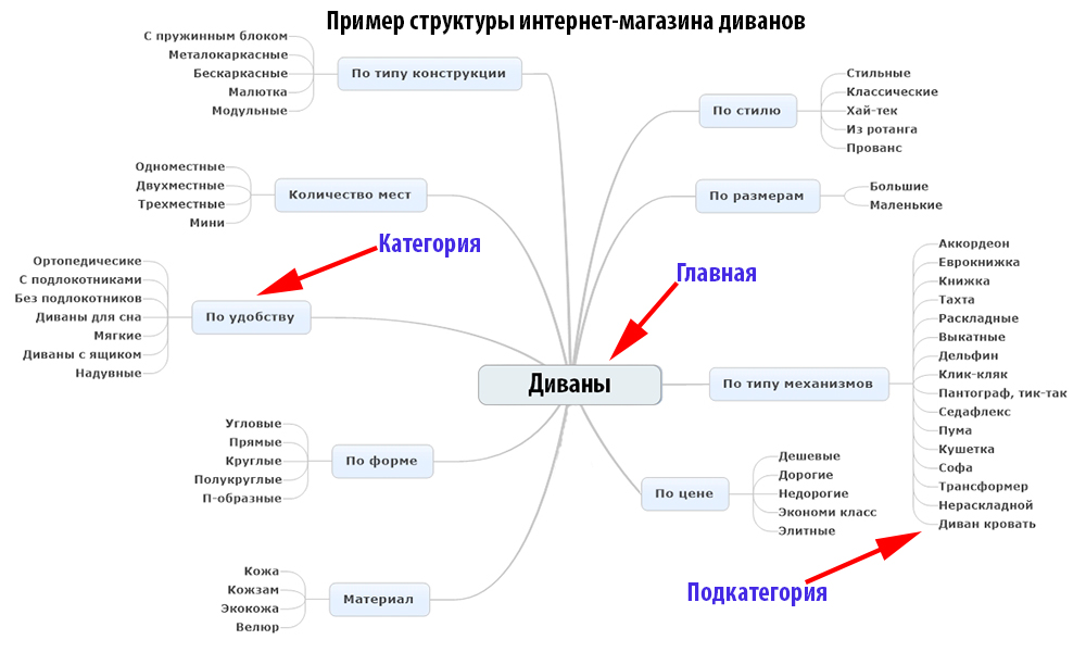 Но структура важна еще и с точки зрения продвижения сайта в интернете: сами названия разделов и иерархия должны соответствовать запросам, которые вводят пользователи в поиске.