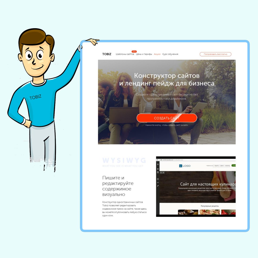 Практически за час позволяет создать современный сайт без необходимости читать инструкции.