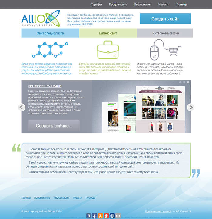 Это очень популярный конструктор на российском рынке — он позволяет практически за бесплатно создавать сайты и настоящие интернет-магазины с возможностью принимать платежи on-line.