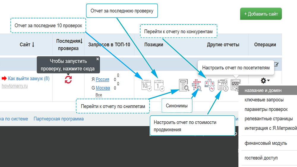 ΠΠ²Π΅Π΄ΠΈΡΠ΅ Π΄ΠΎΠΌΠ΅Π½Π½ΠΎΠ΅ ΠΈΠΌΡ, ΠΊΠ»ΡΡΠ΅Π²ΡΠ΅ ΡΠ»ΠΎΠ²Π° ΠΈ ΠΏΠΎΠΈΡΠΊΠΎΠ²ΡΡ ΡΠΈΡΡΠ΅ΠΌΡ ΠΈ Π½Π°ΠΆΠΌΠΈΡΠ΅ ΠΊΠ½ΠΎΠΏΠΊΡ Ρ ΡΠΈΠ½Π΅ΠΉ ΡΡΡΠ΅Π»ΠΊΠΎΠΉ. ΠΠΎΡΠ»Π΅ ΡΡΠΎΠ³ΠΎ Π² ΠΏΡΠΎΠ³ΡΠ°ΠΌΠΌΠ΅ Π½Π°ΡΠ½Π΅ΡΡΡ Π°Π½Π°Π»ΠΈΠ· ΡΠ°ΠΉΡΠ°, ΠΈ Π²Ρ ΠΏΠΎΠ»ΡΡΠΈΡΠ΅ ΠΎΡΡΠ΅Ρ. ΠΠΎΠΌΠ½ΠΈΡΠ΅, ΡΡΠΎ Π²Ρ ΠΌΠΎΠΆΠ΅ΡΠ΅ ΠΎΡΡΠ»Π΅ΠΆΠΈΠ²Π°ΡΡ ΠΊΠ°ΠΊ ΡΠ²ΠΎΠΉ ΡΠ°ΠΉΡ, ΡΠ°ΠΊ ΠΈ ΡΠ°ΠΉΡ Π²Π°ΡΠΈΡ ΠΊΠΎΠ½ΠΊΡΡΠ΅Π½ΡΠΎΠ².