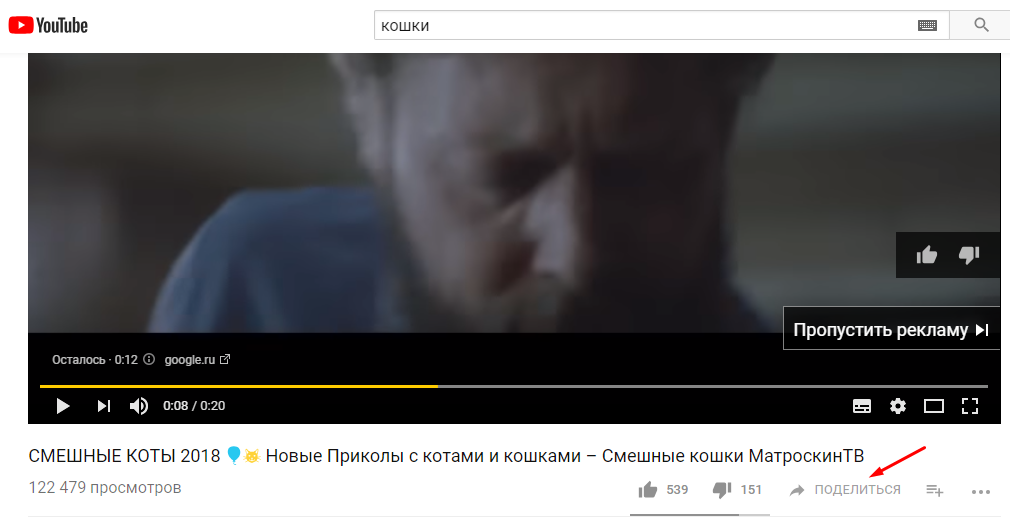 На странице просмотра видео под проигрывателем нажимаем «Поделиться».