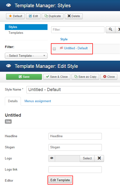 - для Joomla 3: Расширения → Шаблоны → Стили